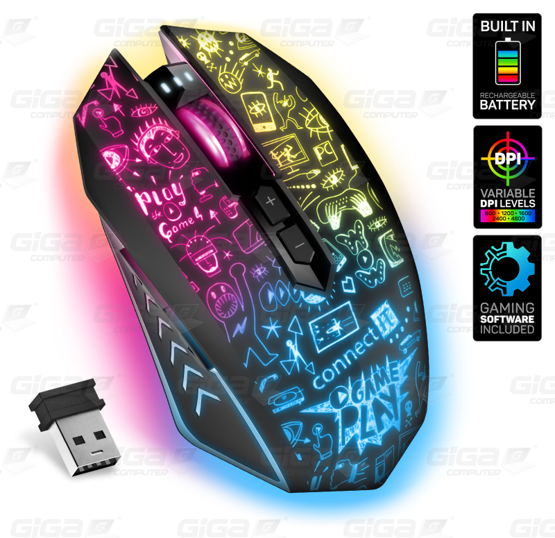 Profesionální bezdrátová gamingová myš DOODLE 2 PRO pro hráče počítačových her s Rainbow podsvícením těla i kolečka.